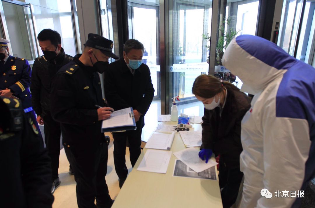 在石景山路54號院的京西商務(wù)中心,由城管執(zhí)法局、城管委、衛(wèi)健委、公安分局、住建委、市場監(jiān)管局、交通支隊、消防支隊、應(yīng)急局等部門工作人員組成的執(zhí)法組對寫字樓的返工狀況開展摸排。