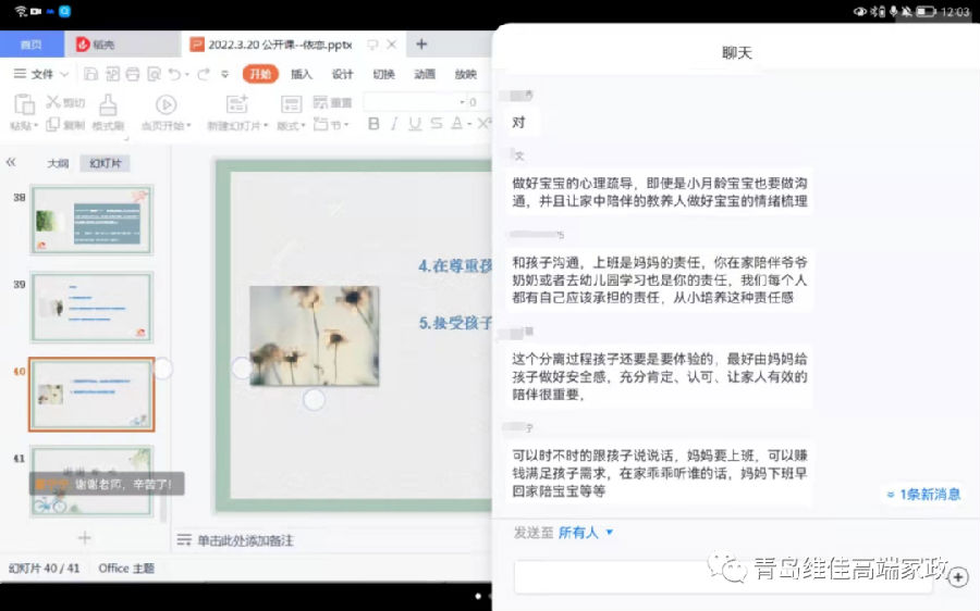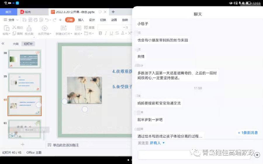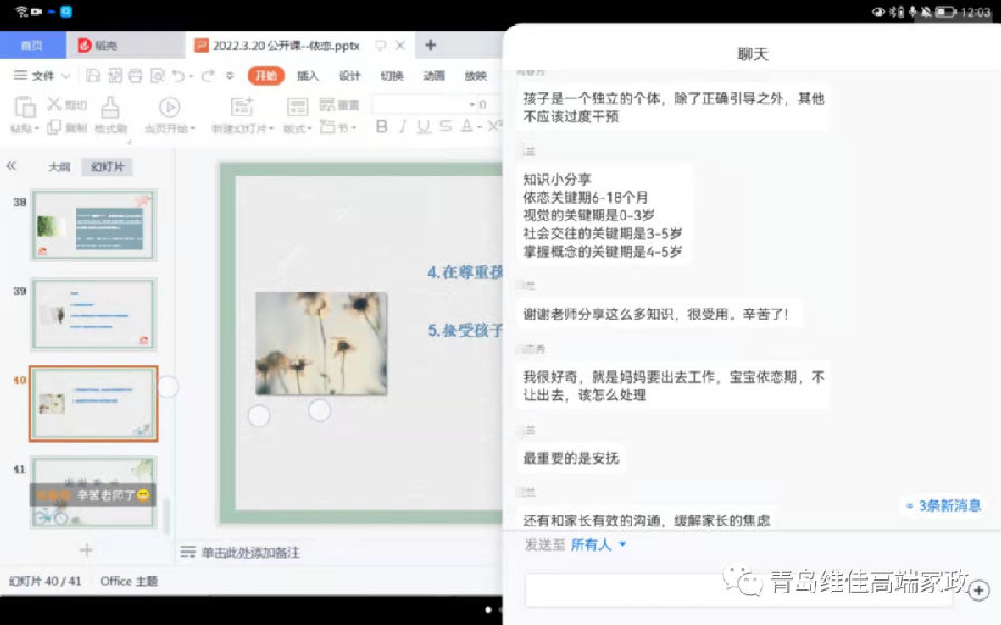 在課程最后我們就寶寶上幼兒園分離焦慮的現(xiàn)象以及小月齡寶寶與依戀對(duì)象分離的應(yīng)對(duì)措施做了分析,找出來一些解決辦法。大家都很棒,各抒己見,很多想法和建議都很有建設(shè)性,更有專業(yè)的幼兒園園長和幼兒教師給大家支招。