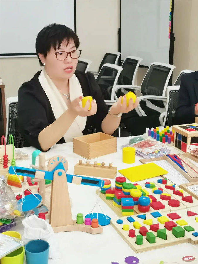 彩色圓柱體由4盒、每盒10個圓柱組成。培養(yǎng)孩子視覺上識別大小、對應概念,發(fā)展手眼動作的協(xié)調(diào),手臂肌肉控制力,培養(yǎng)敏銳的觀察和注意力。Kathleen老師為管家們展示了蒙氏教具的多種操作方法,管家們跟著動手實操,收獲滿滿。